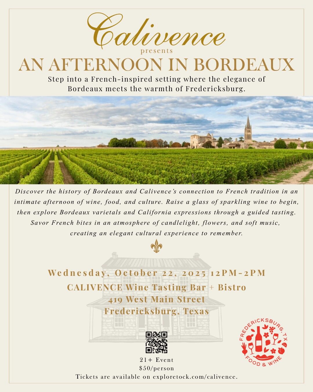 Discover the history of Bordeaux and Calivence’s connection to French tradition in an intimate afternoon of wine, food, and culture. Raise a glass of sparkling wine to begin, then explore Bordeaux varietals and California expressions through a guided tasting. Savor French bites in an atmosphere of candlelight, flowers, and soft music, creating an elegant cultural experience to remember.