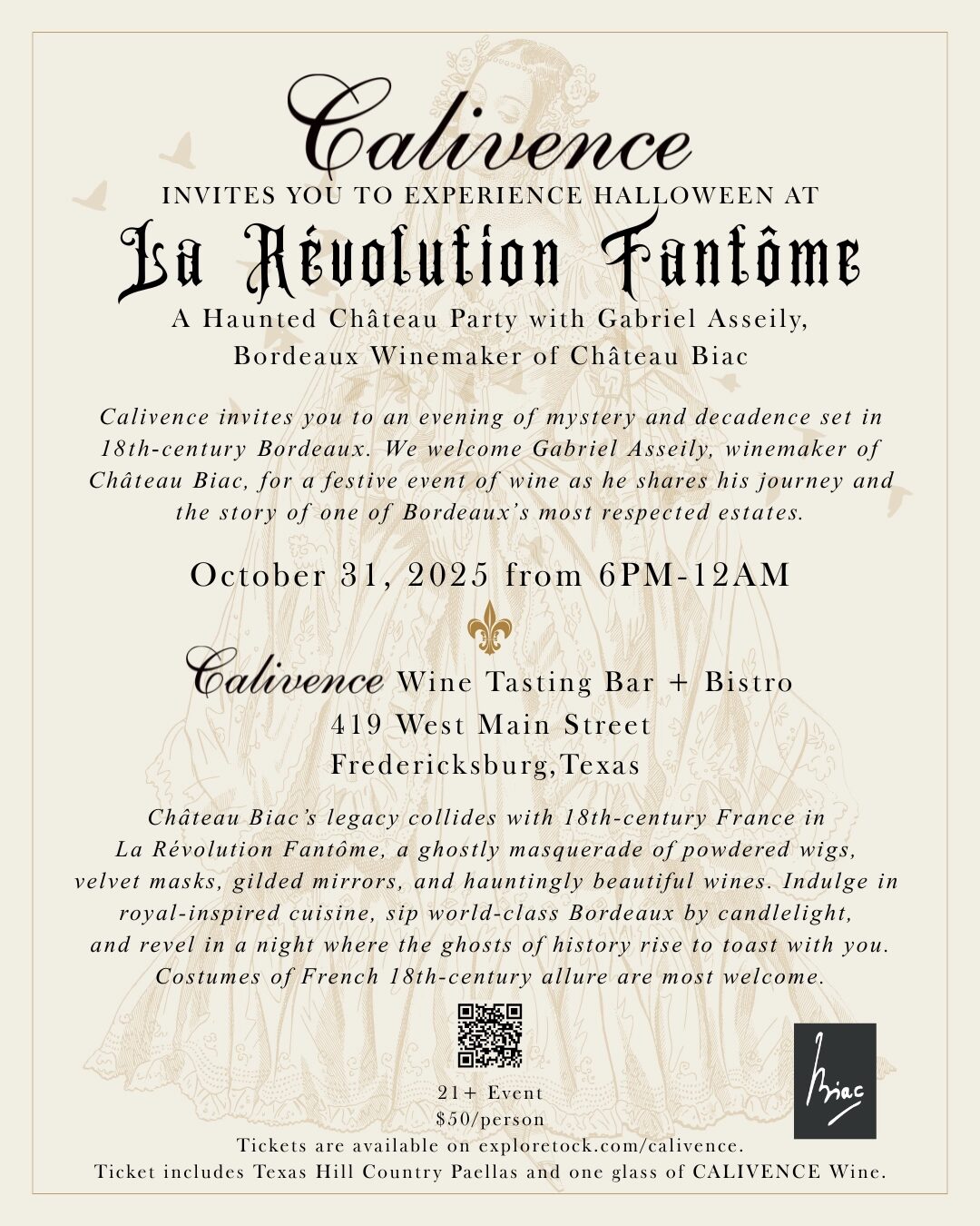 Calivence invites vou to an evening of mystery and decadence set in 18th-century Bordeaux. We welcome Gabriel Asseily, winemaker of Château Biac, for a festive event of wine as he shares his journey and the story of one of Bordeaux’s most respected estates. Château Biac’s legacy collides with 18th-century France in La Révolution Fantôme, a ghostly masquerade of powdered wigs, velvet masks, gilded mirrors, and hauntingly beautiful wines. Indulge in royal-inspired cuisine, sip world-class Bordeaux by candlelight, and revel in a night where the ghosts of history rise to toast with you Costumes of French 18th-century allure are most welcome.