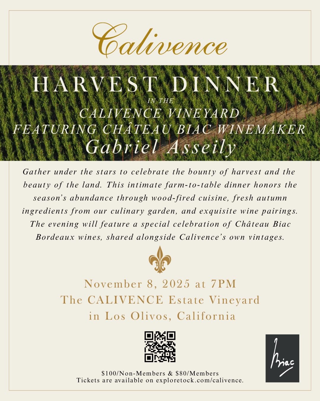 Gather under the stars to celebrate the bounty of harvest and the beauty of the land. This intimate farm-to-table dinner honors the season’s abundance through wood-fired cuisine, fresh autumn ingredients from our culinary garden, and exquisite wine pairings. The evening will feature a special celebration of Château Biac Bordeaux wines, shared alongside Calivence’s own vintages.